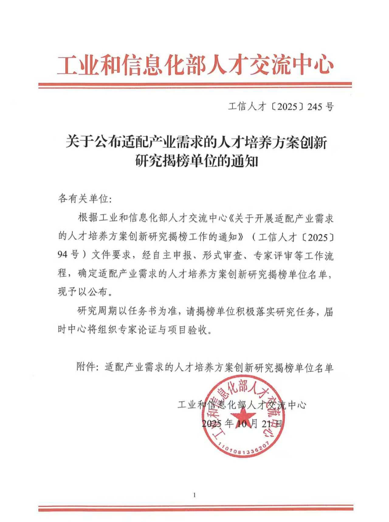 近日,工业和信息化部人才交流中心正式公布适配产业需求的人才培养方案创新研究揭榜单位名单,江西财经职业学院信息安全技术应用专业群凭借扎实的专业基础、创新的培养模式与深度的产教融合成果成功入围。