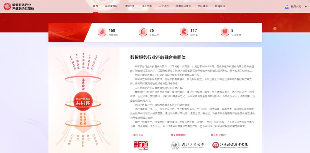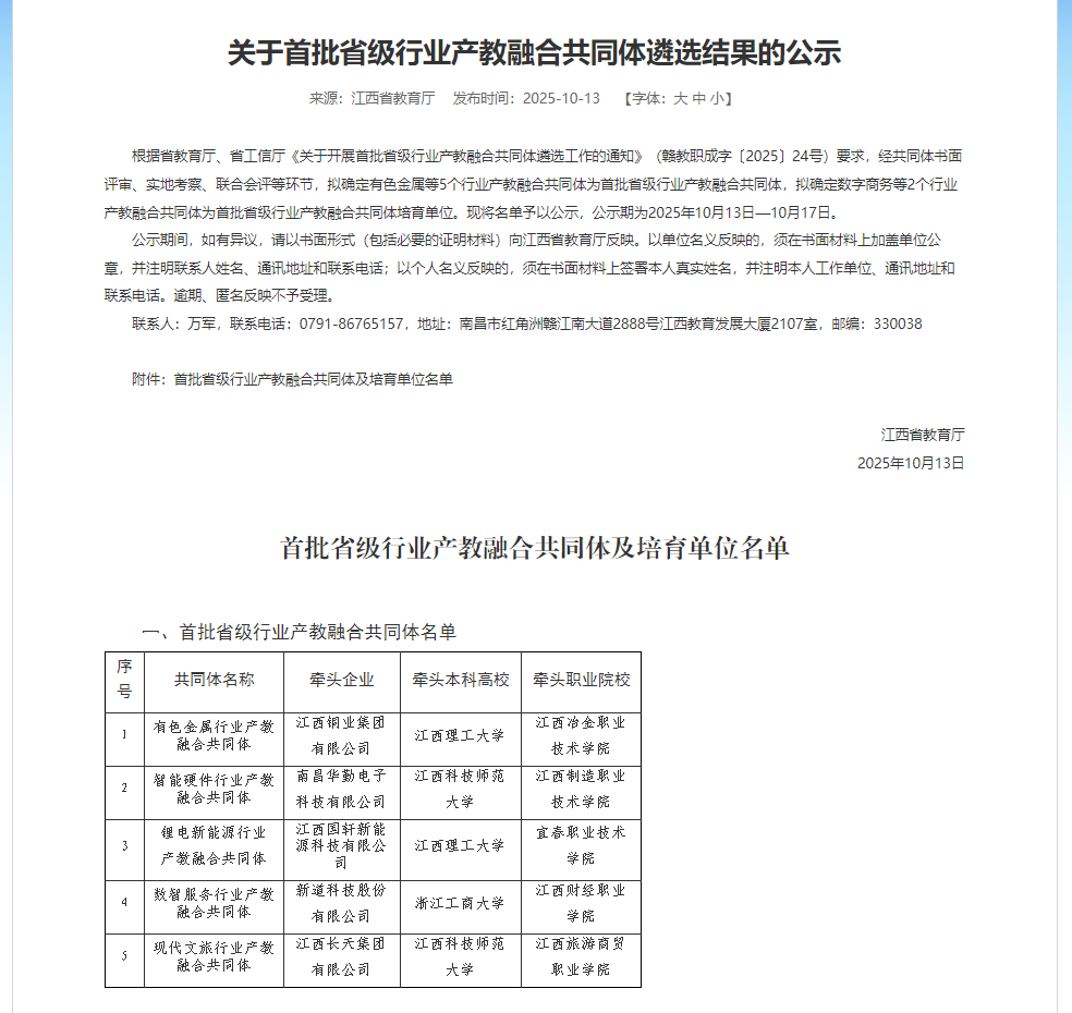 10月13日,江西省教育厅正式公布首批省级行业产教融合共同体遴选结果,由我校与浙江工商大学、新道科技股份有限公司联合牵头申报的“数智服务行业产教融合共同体”成功入选首批省级行业产教融合共同体名单。共同体自2024年4月成立以来,立足江西省财经商贸生产性服务业,服务江西省“1269”行动计划和九江市“9610”工程,更加聚焦其中的食品、纺织服装、医药等区域重点产业的财务、物流、营销等岗位群能力需求,构建了“产、学、研、创、用、服”六位一体的高质量产教融合生态平台,为全面提高财经商贸类高技能人才培养质量提供了有力支撑。